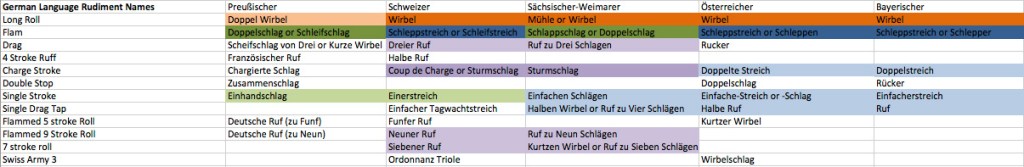 The regions for which I have a good (or at least ok) idea of the terms are: Prussia, Switzerland, Saxe-Weimar-Eisenach (I’ll call this Weimar subsequently), Austria, and Bavaria. I really do not know the relevant terminology for Hesse or Hannover or any other region. Due to an odd royal connection they used British drumming in Hannover for quite some time, but I am unsure of what they called the rudiments. The image is a chart of the terms over the regions I know something about.